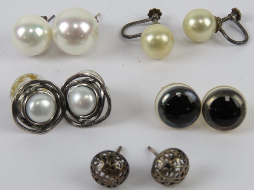 A pair of silver and pearl stud earrings together with two other pairs of silver earrings and two pairs of earrings with white metal backs. Total five pairs.