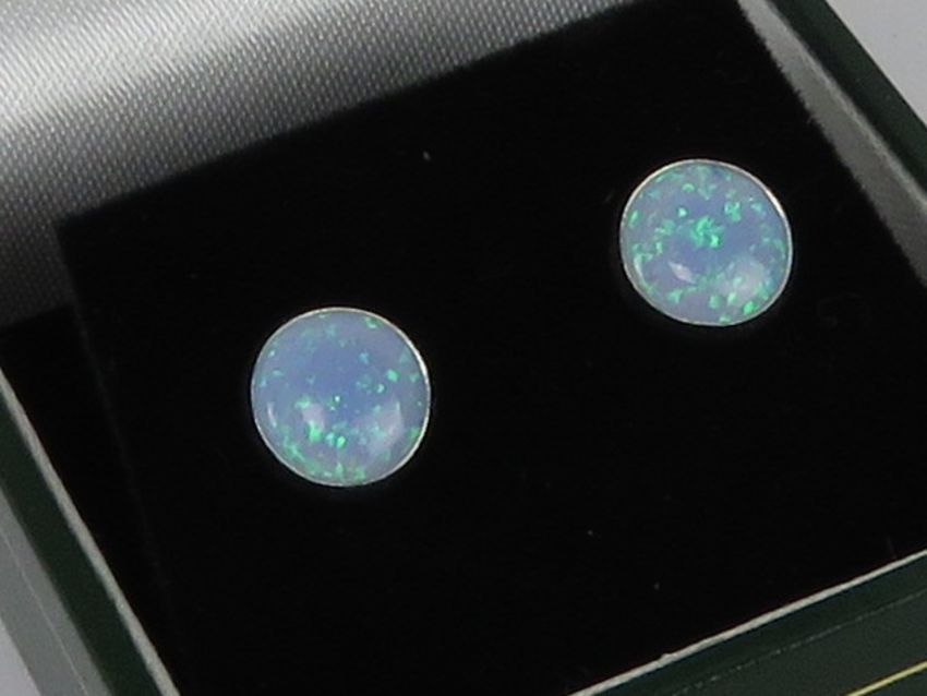 A pair of silver and opal stud earrings, stamped 925, with 925 silver butterfly backs, in presentation box.