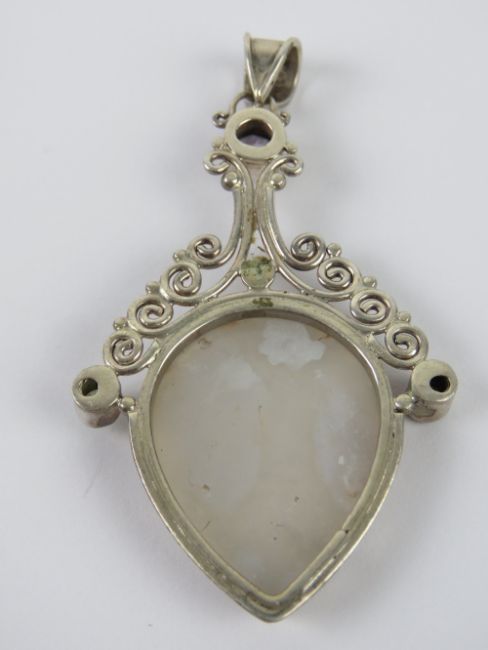 A large silver and druzy agate pendant having amethyst and peridots upon, stamped 925 and measuring 6.5cm inc bale.