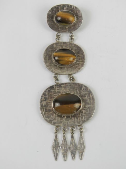 A large and impressive silver and tiger's eye pendant measuring 14.3cm in length having three graduated panels with diamond shaped segments suspended below, each panel set with oval tiger's eye cabachon, stamped Israel 925.