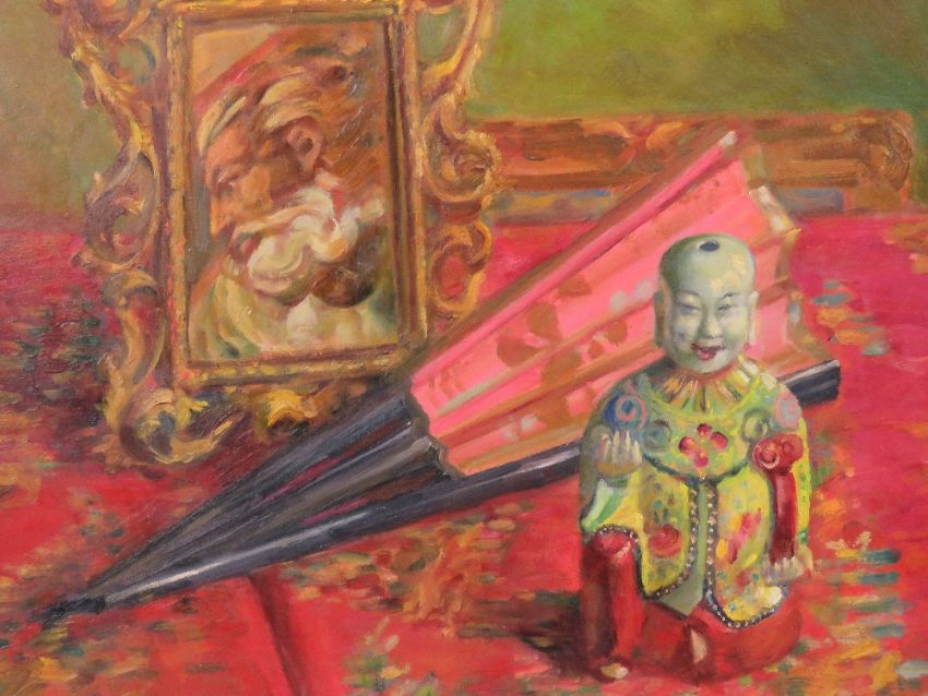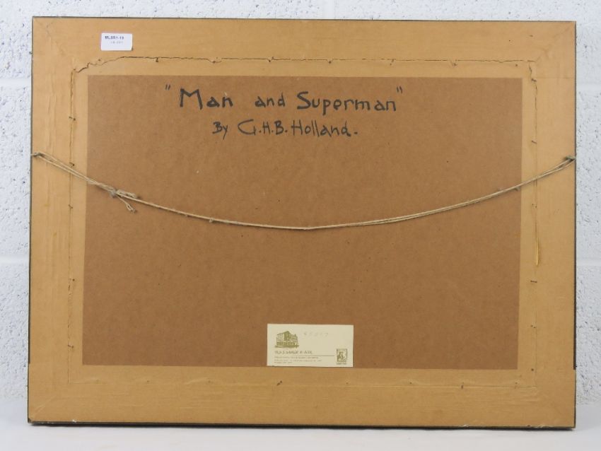 GHB (George) Holland (1901-1987), oil on board, entitled 'Man and Superman' depicting a framed painting with Oriental fan and deity before, signed upper right, framed, sight size 55 x 38cm.