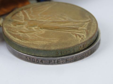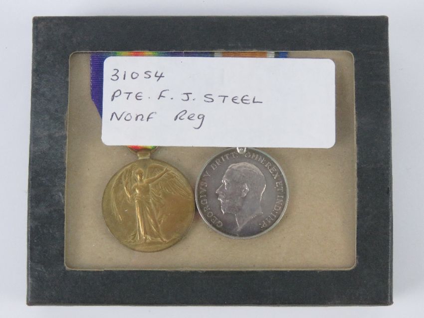 A WWI Victory and War Medal pair, engraved for Pte. F. J. Steel 31054 Norfolk Regiment.