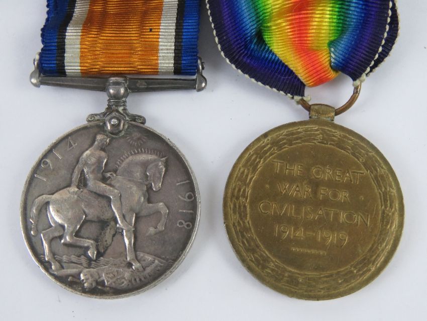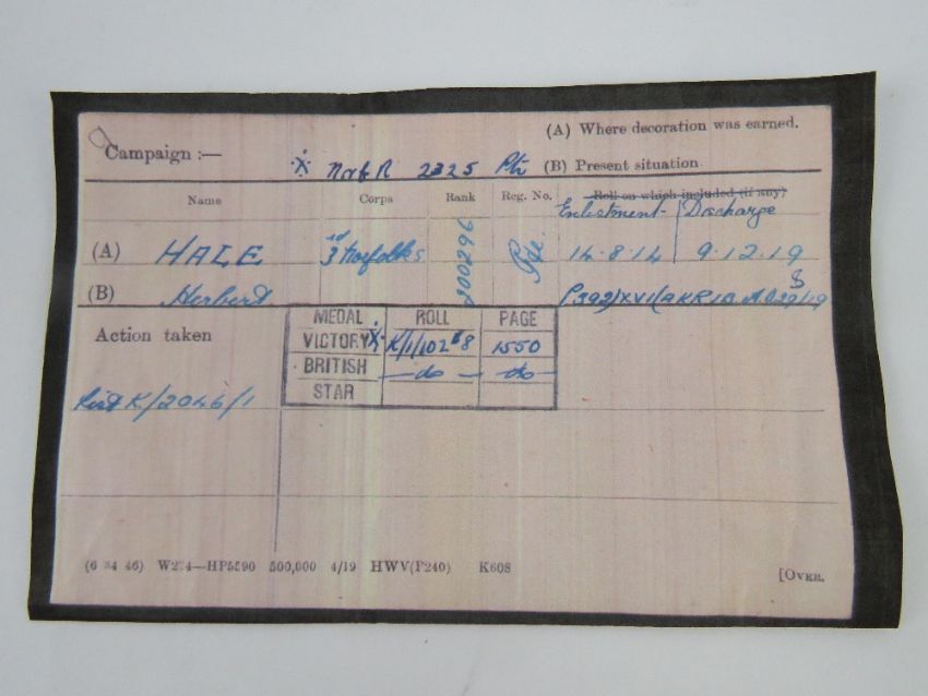 A WWI Victory and War Medal pai, engraved for Pte. Herbert Hale. Also copy Medal Card.