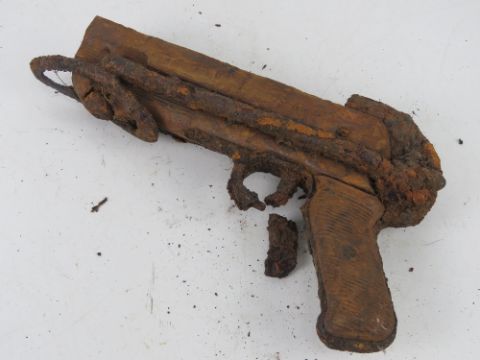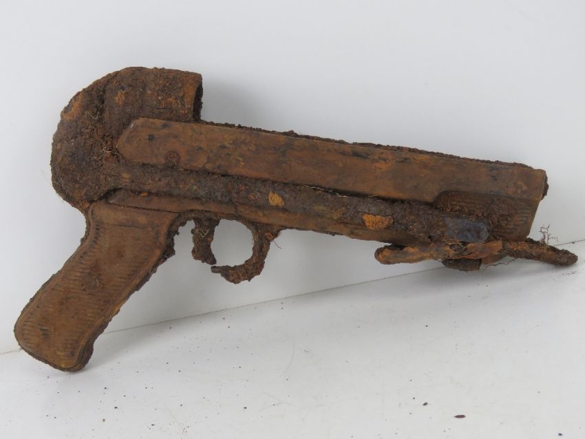 An MP40 bottom receiver in relic condition, with stock, pistol grip and trigger. Recovered from the Kurland Pocket.