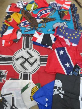A quantity of assorted contemporary and reproduction military flags; WWII German, USA, etc. Also two Flag Towels