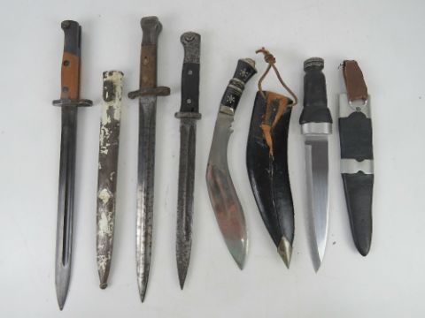 A Scottish skean dhu (Sgian Dubh). Together with three bayonets and a Kukri Gurka knife. Five items.