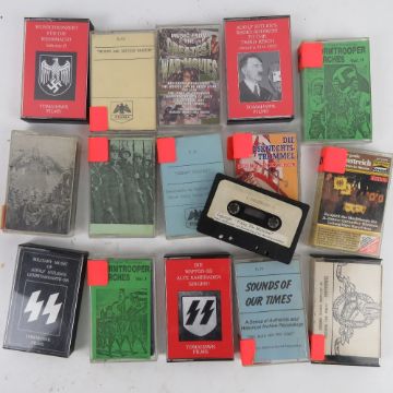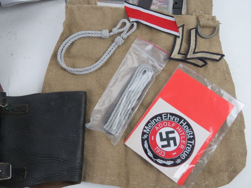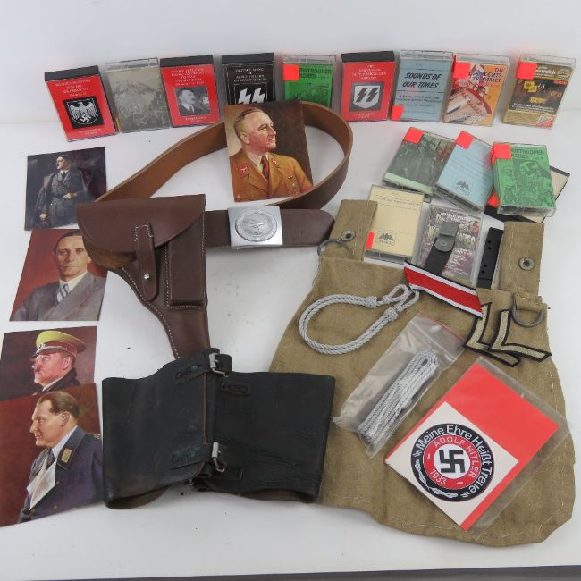 A quantity of assorted military themed and reproduction military items; 15x German WWII music cassettes.1x Walther PPK holster, belt, Luftwaffe belt buckle and magazine. 5x German Colour postcards (1x Dr Ley, 1x Goebbels, 2x Hitler, 1x Goring) size5 ½ x 4 ¼ inches. 1x German breadbag. 1x German visor cap chinstrap. 1x pair German leather gaiters. 4x assorted German insignia. 1x German sticker.