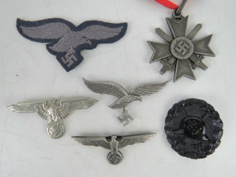 A quantity of assorted reproduction militaria; 1x flag, 2x cuff titles, 4x badges,1x cloth eagle, 1x ribbon, 1x German medal.