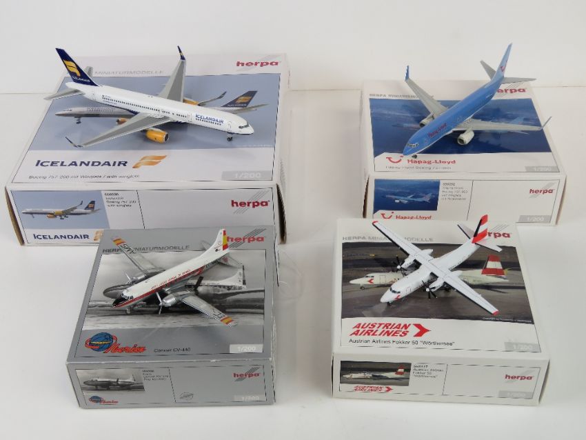 Four 1/200 scale model aircraft by Herpa, each in box, being Iberia Convair CV-440, Hapag-Lloyd Boeing 737-800, Icelandair Boeing 757-200 and Austrian Airline Fokker 50 'Wothersee'. .