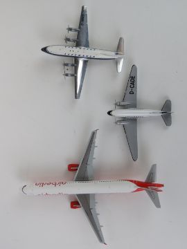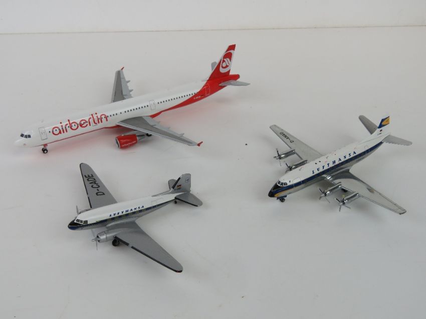Lufthansa Vickers Viscount 814 D-ANAD and Douglas DC3D-CADE 1/200 scale model aircraft by Herpa, each in box. Together with an Air Berlin.com Airbus A321 1/200 scale model aircraft by Herpa in box. Three items.