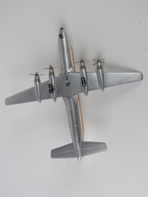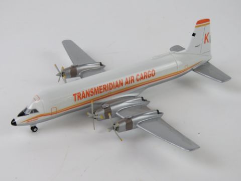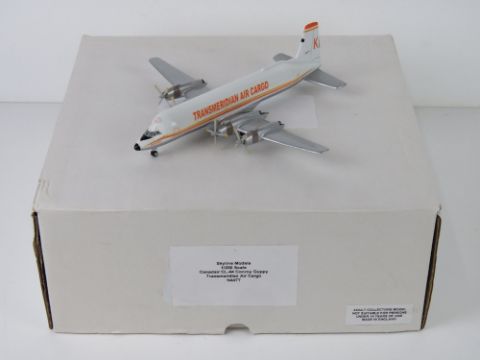 Canadair CL-44 Conroy Guppy Transmeridian Air Cargo N447T, 1/200 scale model aircraft made by Skyline Models, in box (packaging a/f).