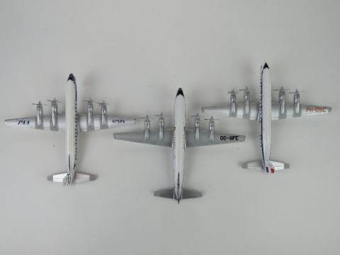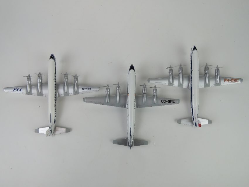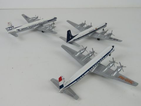 Three Douglas DC-7C 1;200 scale die cast model aircraft, each by Hobbymaster and in original boxes, being KLM 'PH-DSC' Amsterdam 1959 item HL7005, PanAmerican World Airways 1956 'N731PA' item HL7001 and Sabena 'OO-SFE' item HL7004.