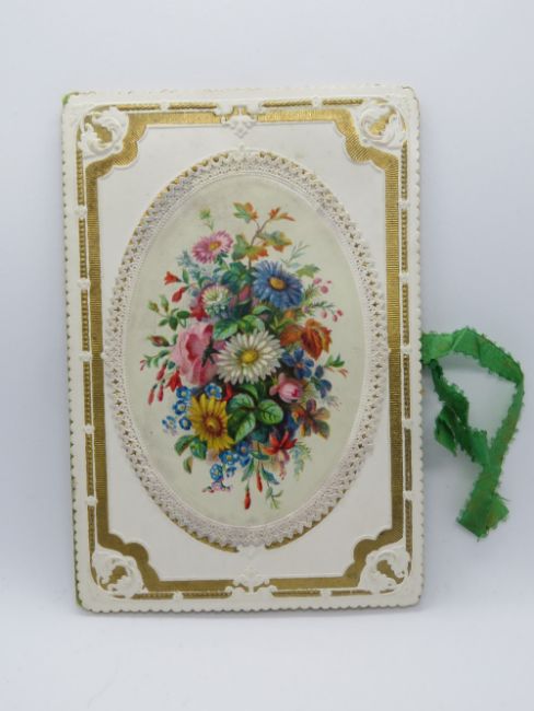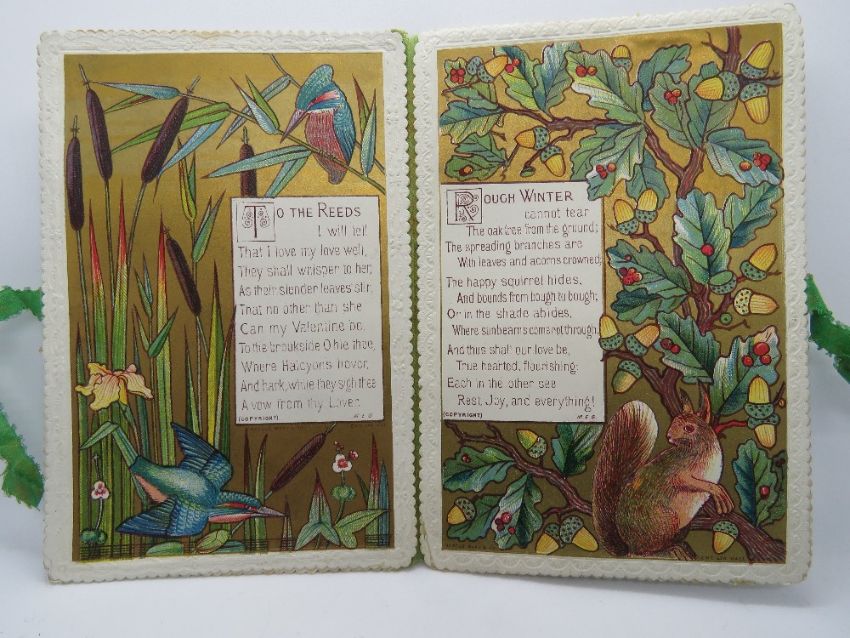 Marcus Ward and Co; a Victorian Sweetheart or Valentines card having floral motif to front and opening to reveal delightful gilt decorated scenes within of kingfishers in bulrushes and squirrel in oak tree, having verse 'To the Reeds' and 'Rough Winter', marked '(copyright) M.E.G.' and 'Marcus Ward & Co Ent Sta Hall', 12 x 8cm.
