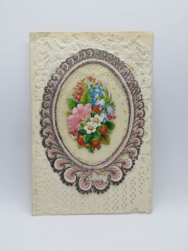 A decoupage Sweetheart or Valentines card, central bouquet on paperlace, no message within, approx 12 x 8cm.