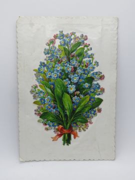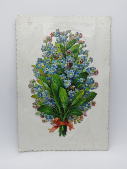 A Victorian perfumed sachet Birthday card, having central yellow rose applied overprinted fabric window, sealed having bouquet of Forget-Me-Not flowers verso, approx 12 x 8.5cm.