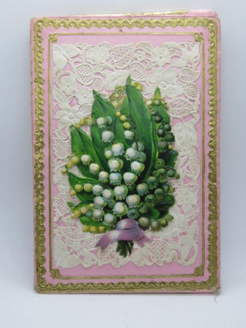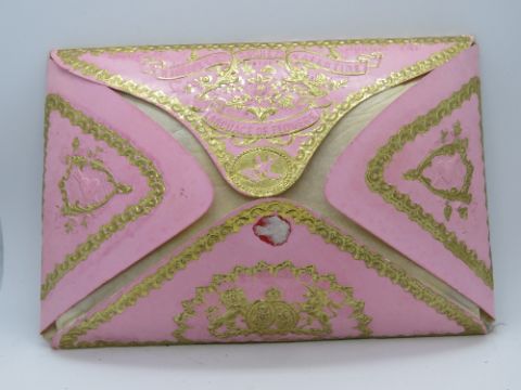 Eugene Rimmel; a Victorian pink perfumed sachet valentine card, applied with embossed pierced paperlace with a chromolithographic lily of the valley floral centre, lifting to reveal a printed verse entitled 'Modest Beauty', the reverse decorated in gilt, blind stamped 'Rimmel's Sachet Valentine. Language of Flowers. Rimmels Perfumer to H.R.H. The Princess of Wales'. Having original contents (a/f), 15.5 x 10.5cm.