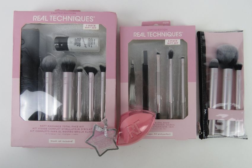 Real Techniques; A seven piece gift set ' soft radiance' inc brushes and makeup brush roll (box a/f) together with a five piece gift set, a pack of three brushes and a make up sponge, all by Real Techniques. Four items.