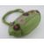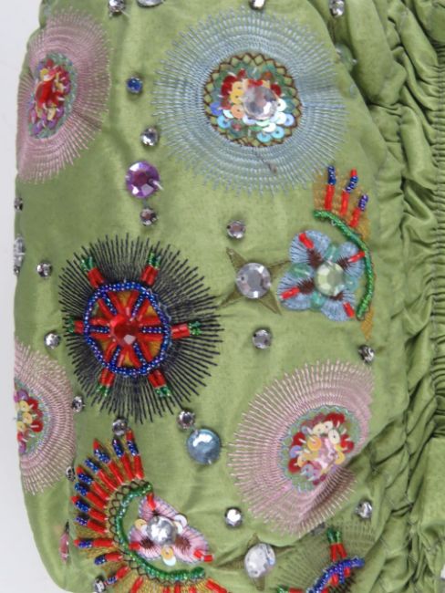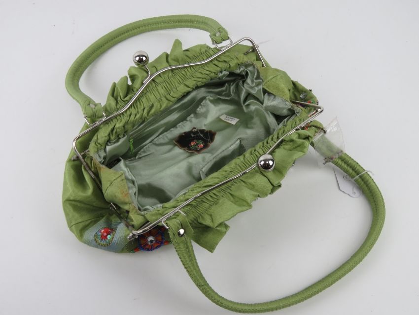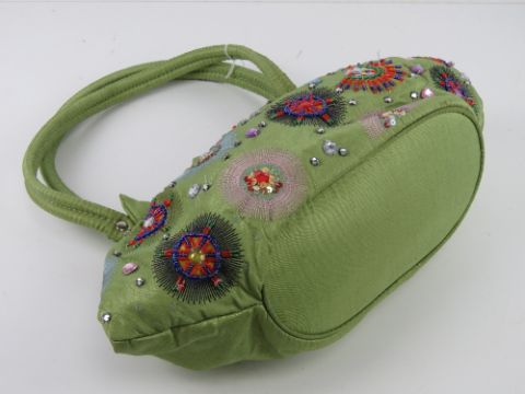 A lime green fabric handbag having embroidered pattern upon.
