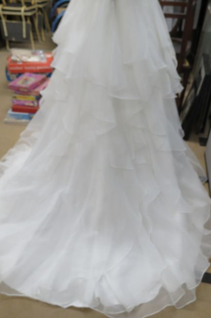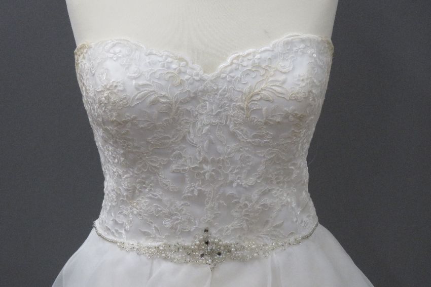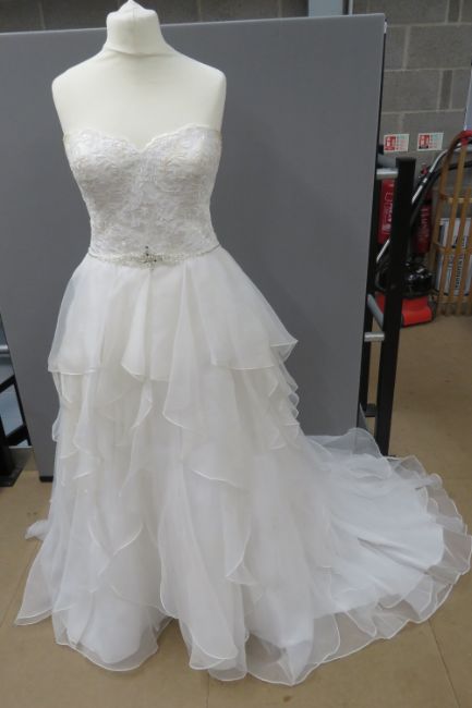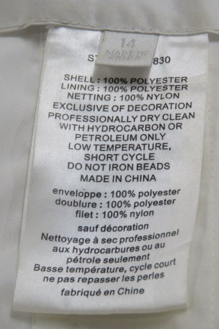 A wedding dress by David Bridal, size 14, in need of dry cleaning.