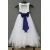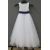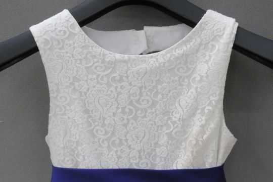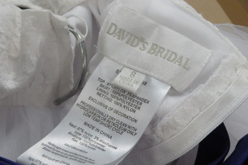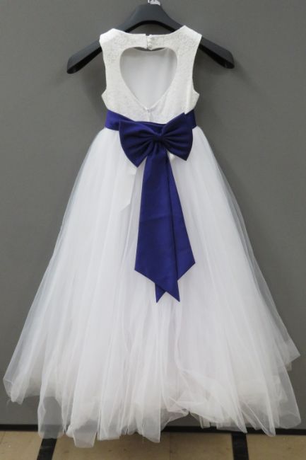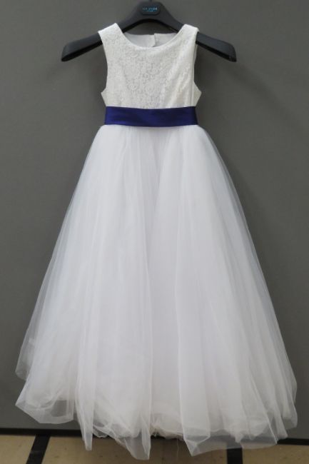 A flower girl dress with purple sash and tulle skirt by David Bridal, age 8.