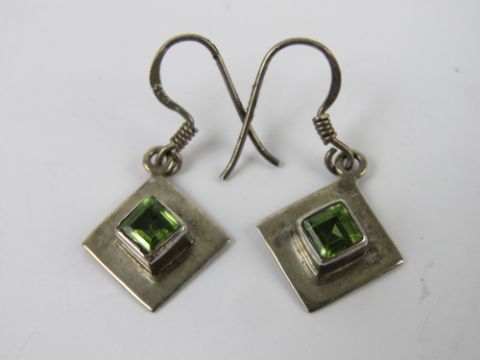 A pair of silver and peridot square shaped earrings, stamped 925, 3cm drop.
