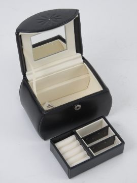 A contemporary black leather jewellery case having various compartments within. 12 x 8 x 13cm.