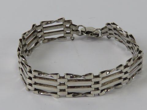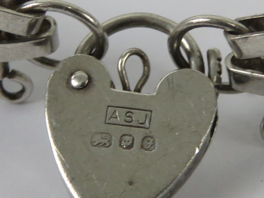 A silver gate link bracelet having London hallmarked heart padlock clasp.