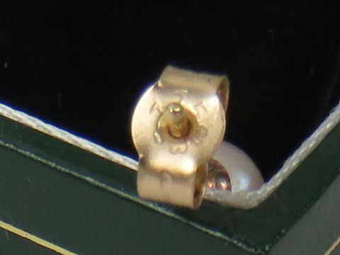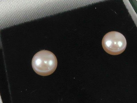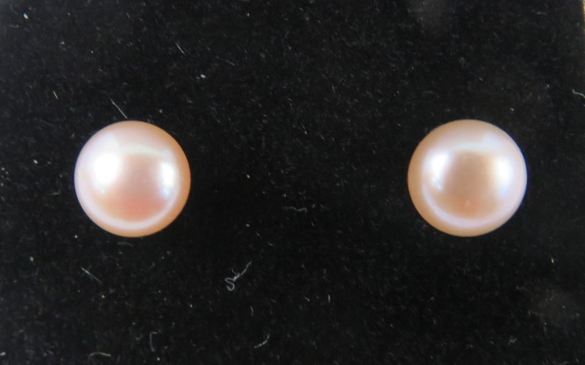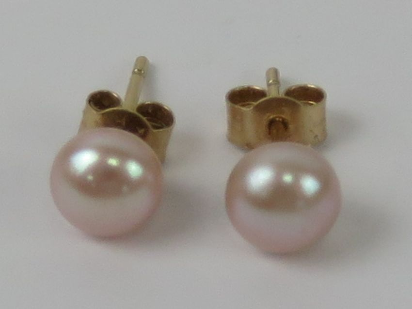 A pair of 9ct and pale pink pearl earrings with butterfly backs, stamped 9ct.