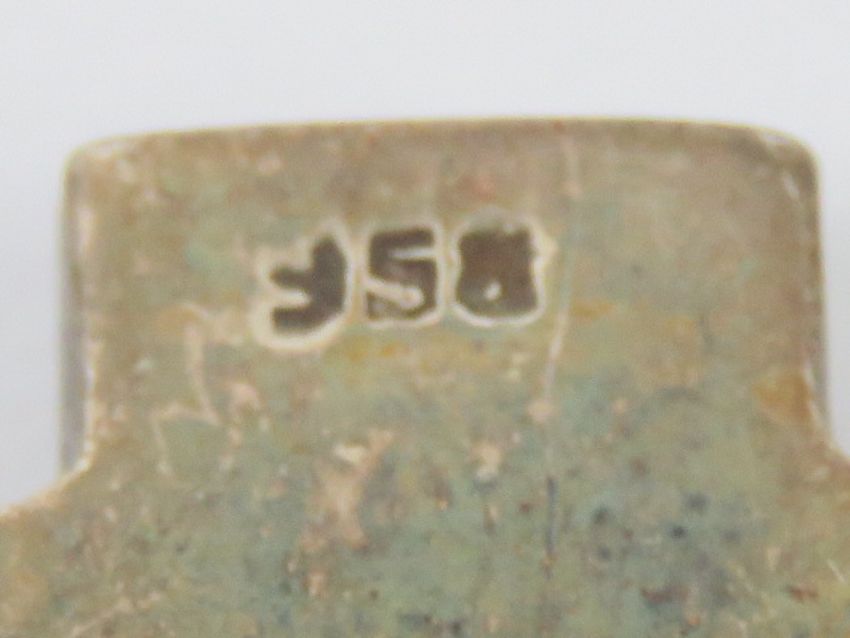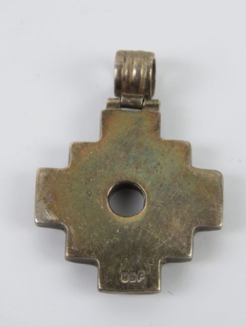 An unusual white metal pendant having cross form with articulated bale, 3.7cm in length.