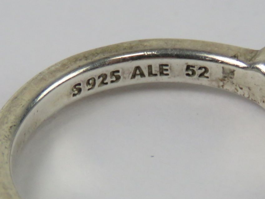 A silver Pandora ring with heart padlock upon, stamped 925 ALE, size L-M. Together with two other silver rings, sizes R-U.