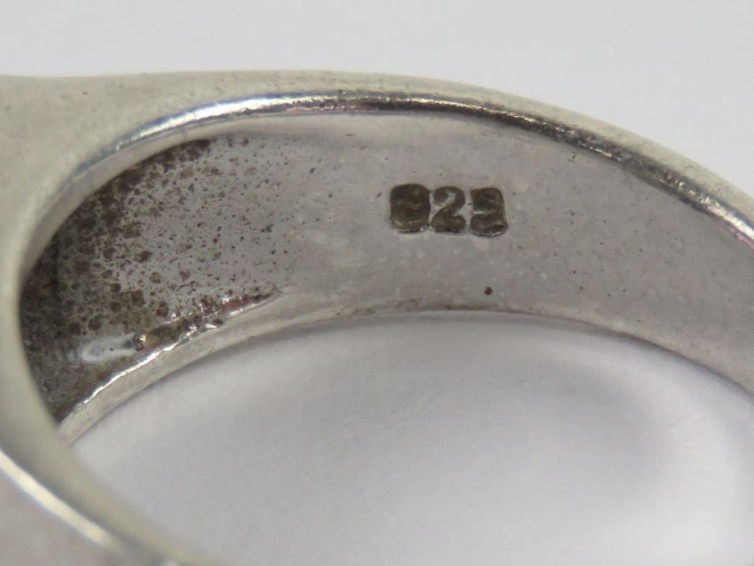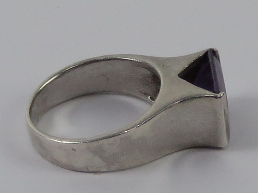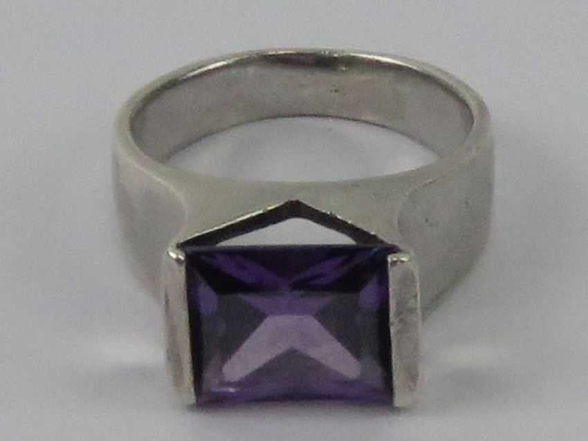A silver and amethyst ring, rectangular cut stone, stamped 925, size N-O.