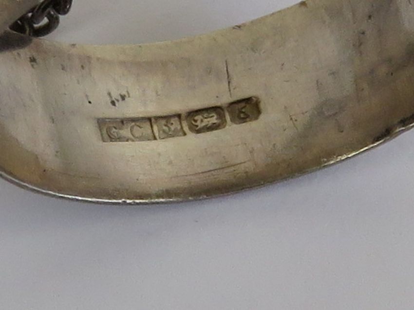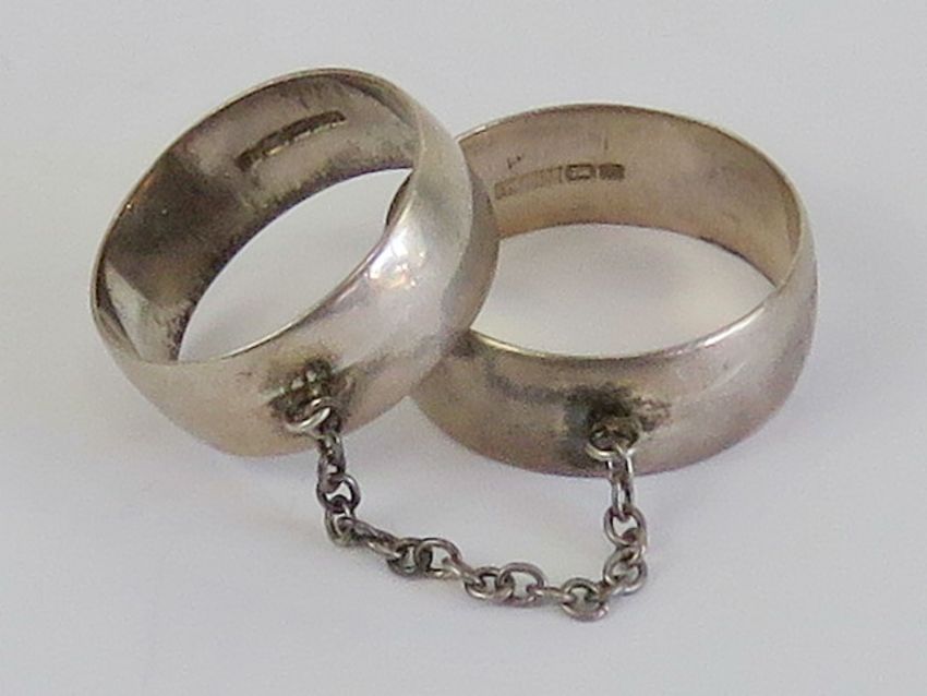 An unusual pair of HM silver Bohemian style 'slave rings' attached by chain, plain form size P-Q and V, each hallmarked Birmingham 1979.