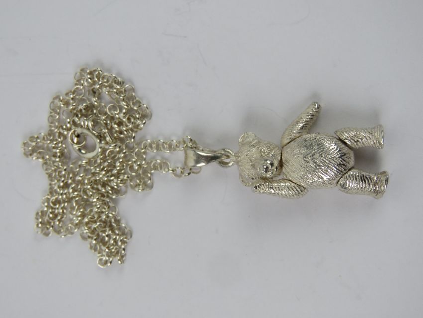 A HM silver articulated teddy bear pendant, hallmarked 925 and measuring 3.2cm inc bale, on silver chain.