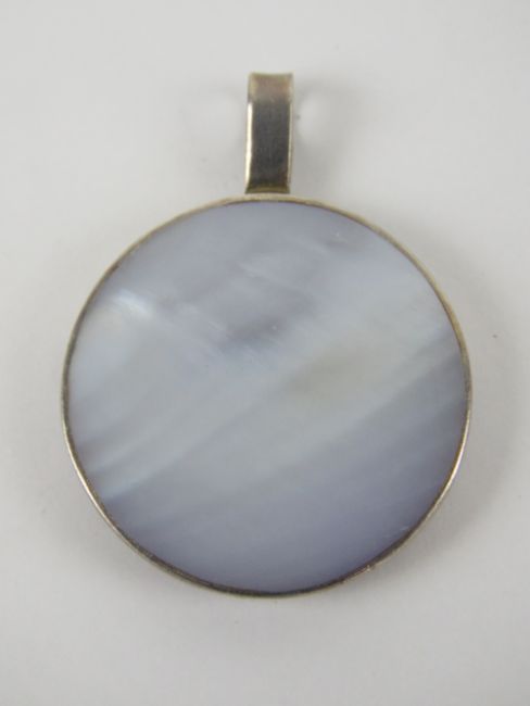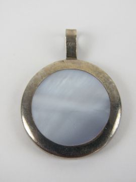 A mother of pearl and silver pendant of circular form, stamped 925, 3.8cm dia.
