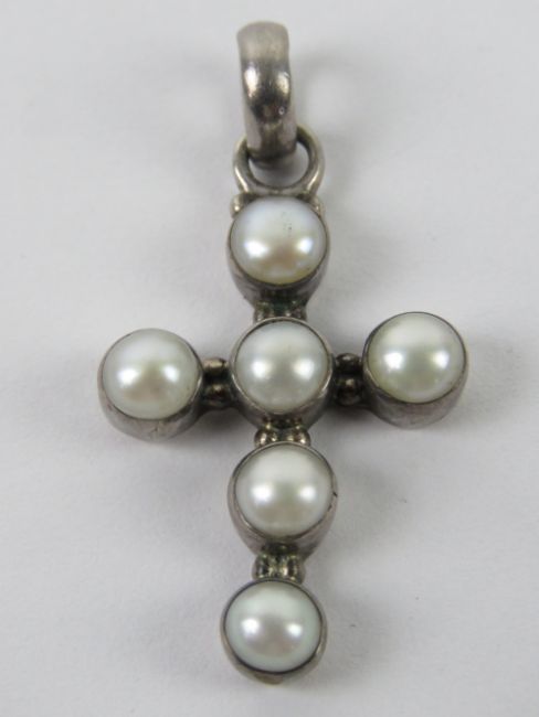 A silver and pearl crucifix pendant, stamped 925 and measuring 4cm in length.