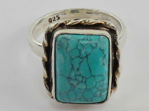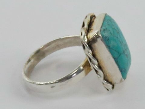 A handmade turquoise ring, rope twist setting, stamped 925, size P-Q.