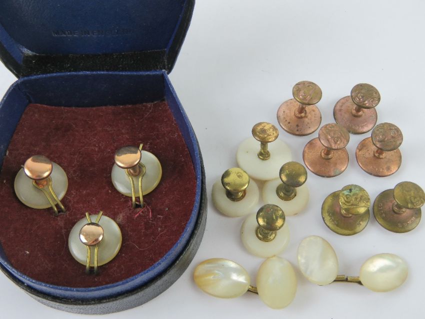 A leather shirt stud box 'A stud in the box is worth two under the bed'', containing a quantity of shirt stud and cufflink sets.