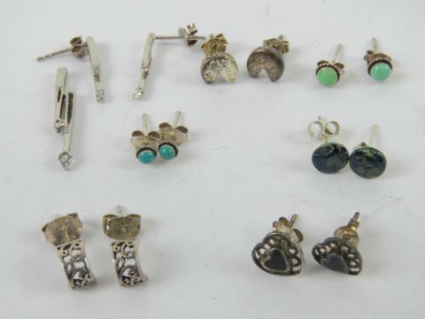A white stone set silver pendant with matching earrings, stamped 925. Together with six other sets of silver stud earrings.
