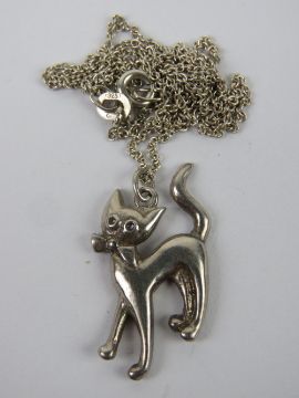A 925 silver chain having white metal cat pendant upon.