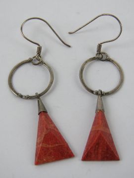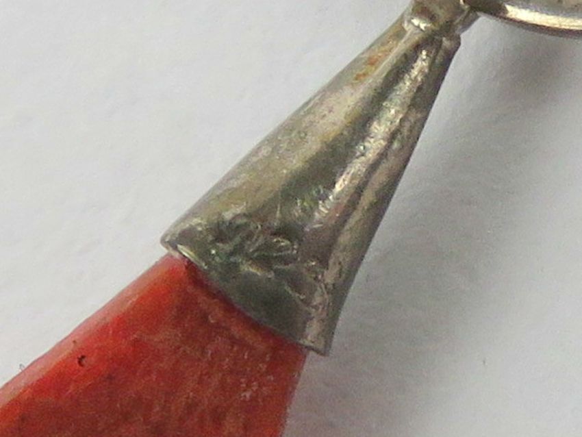 A pair of white metal and faux coral earrings, no apparent hallmarks, 5.5cm drop.