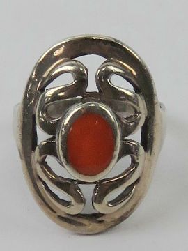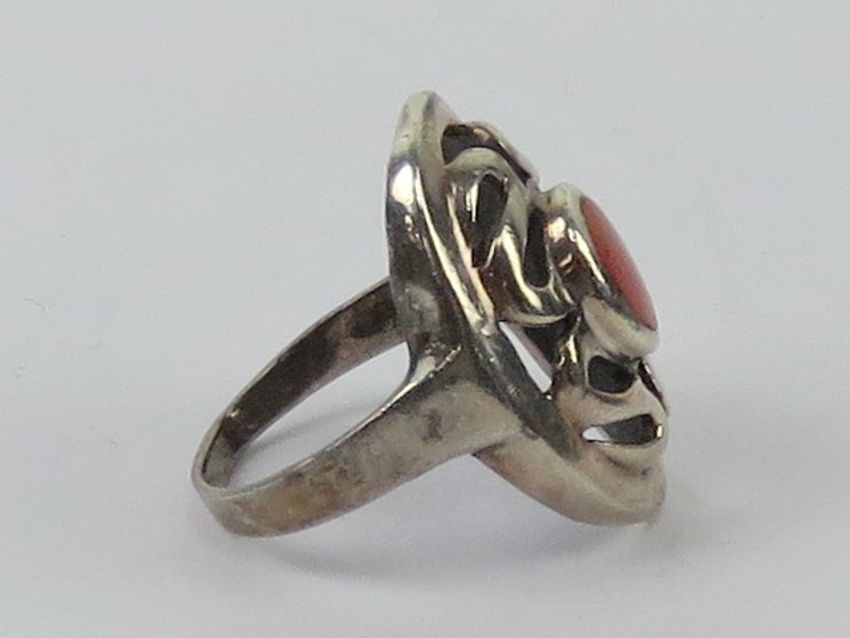 A silver and carnelian ring having pierced pattern in oval frame, stamped 925, size M-N.