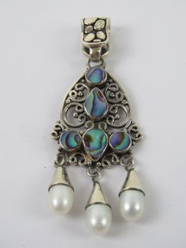 A silver pearl and mother of pearl pendant, stamped 925 and measuring 6.1cm in length.
