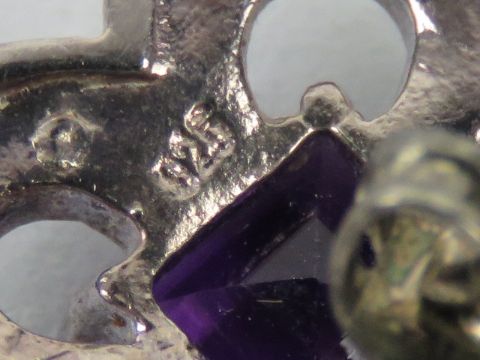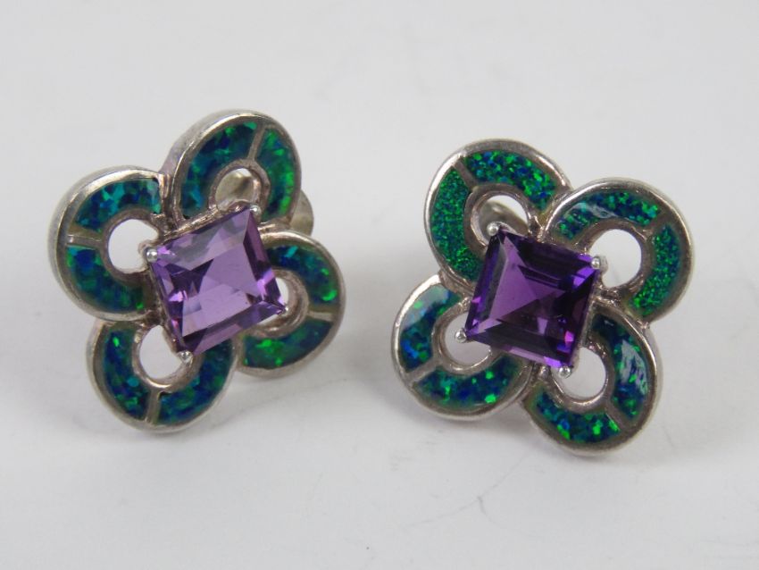 A pair of 925 silver earrings having central square cut purple stone and opalescent sections surrounding, each earring measuring 1.5cm wide.