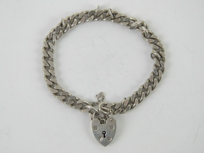 A HM silver heavy curb link bracelet having heart padlock clasp, hallmarked to clasp and to central link of chain, 22.1g.