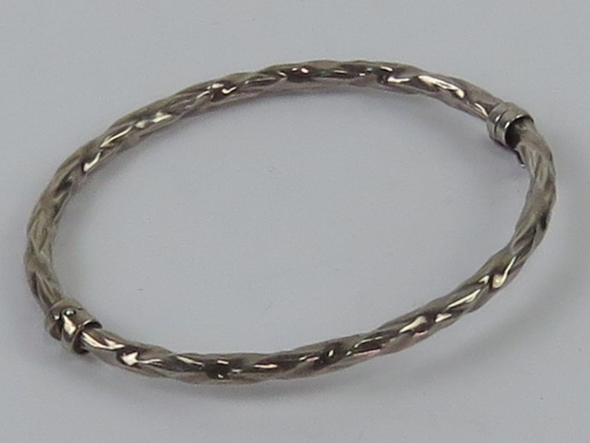 An hallmarked silver hinged bangle having safety clasp, internal dia 6 x 5.2cm, hallmarked for Sheffield, 7.8g.
