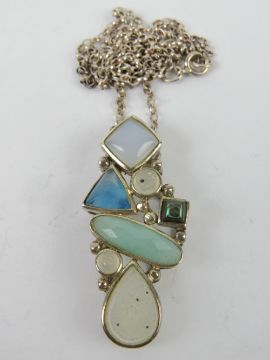 A silver and assorted agate pendant, stamped 925, 3.8cm in length, on silver chain.