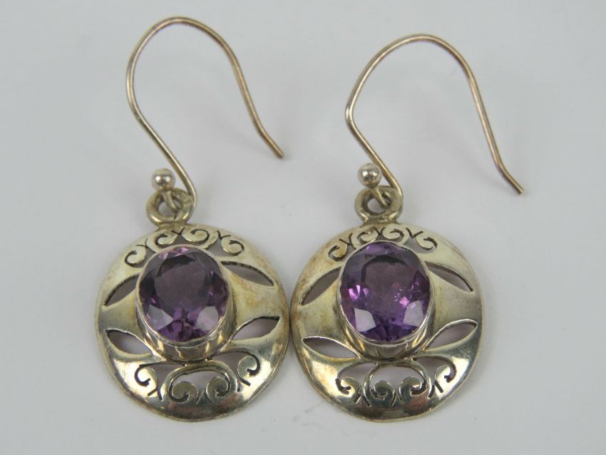 A pair of amethyst earrings, pierced scroll design, 4cm drop.