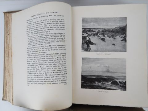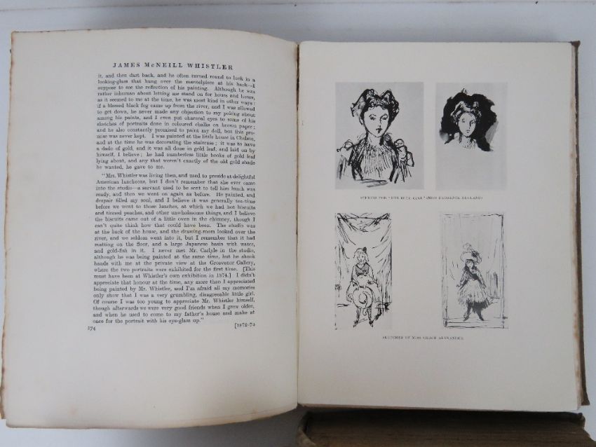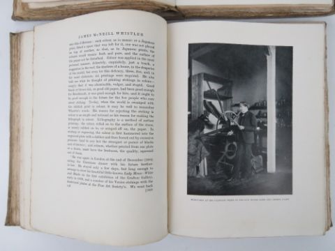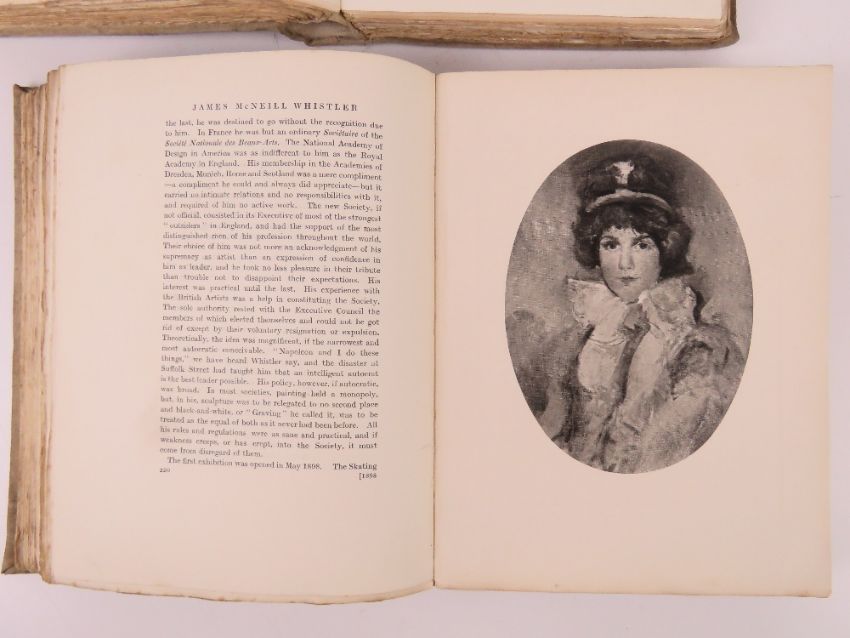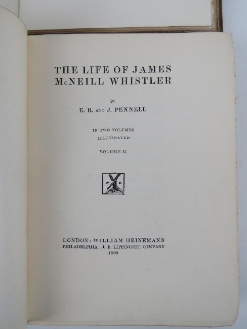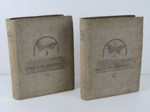The Life of James McNeill Whistler, 1st edition having unique handpainted cloth cover featuring a Whistler 'Signature Butterfly' in the style of those found in the background of Whistler's works 'Arrangement in Grey and Black NoII' portrait of Thomas Carlyle, and 'Harmony in Grey and Green' portrait of Miss Cicely Henrietta Alexander. Written by ER & J Pennell. Published London, William Heinemann, 1908, in two volumes.
