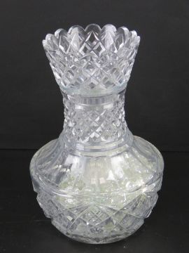 A lead crystal heavy cut glass two sectional lily vase, containing a quantity of glass beads, 28cm high. Together with an associated lead crystal cut glass circular stand 31cm dia.