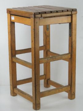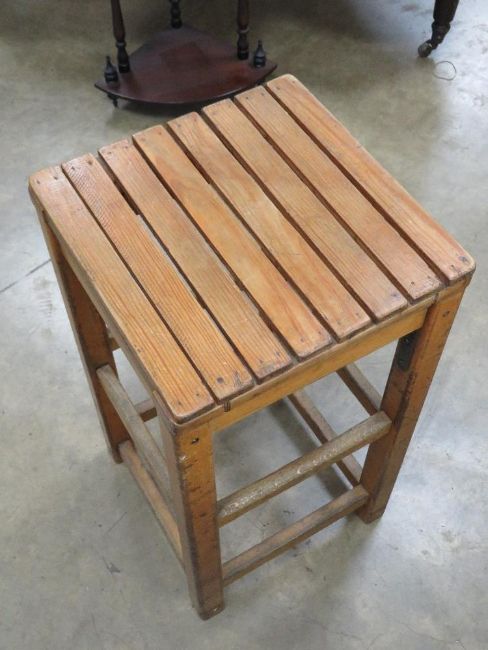 A pine stool having slatted seat, 35 x 35 x 63.5cm.
